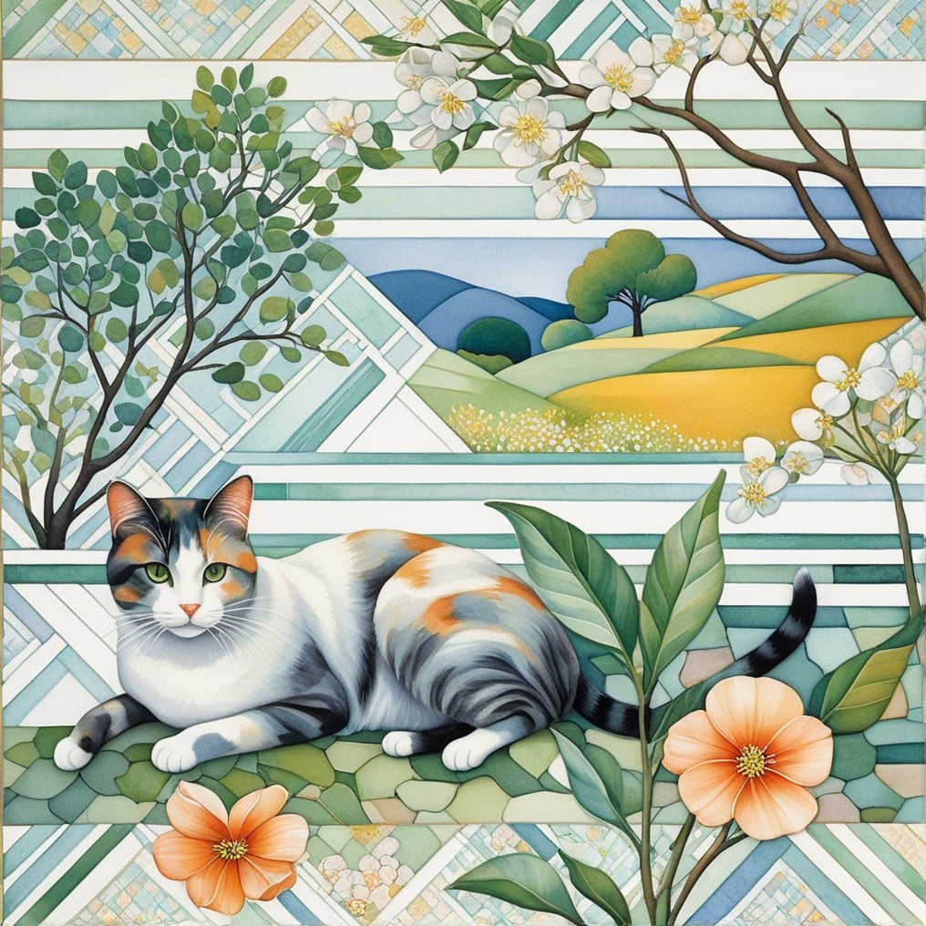 A calico cat lounges near a deck chair in cubist style.