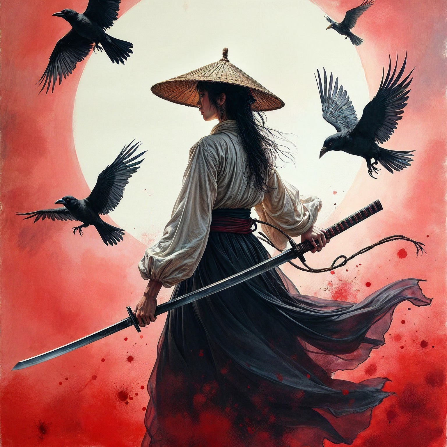 (Try from Sam Rajabi) - A figure in traditional attire holds a sword, facing a large, glowing red moon. Crows circle around, creating a mystical atmosphere that blends warrior spirit with nature's elements.