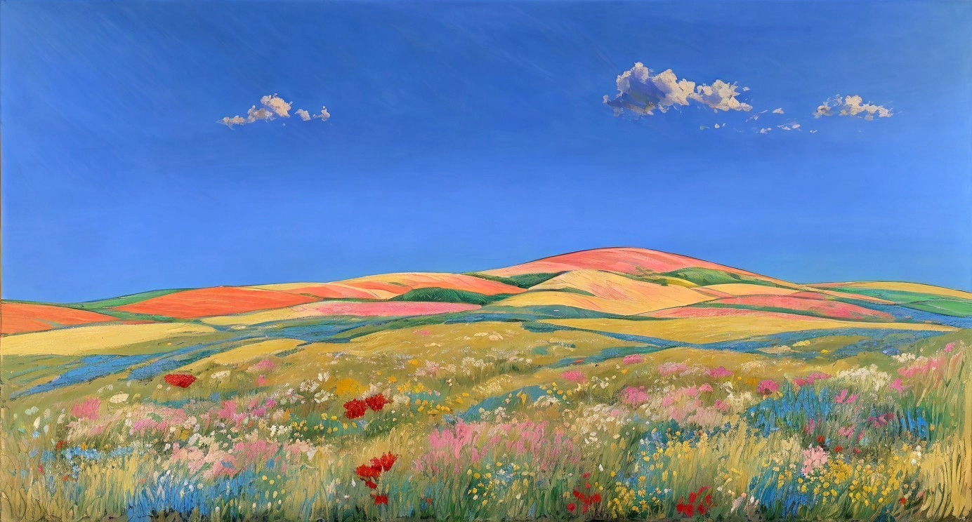 A landscape of bright grassland on the slope of a hill, with a tapestry of colorful wildflowers under a pure blue sky accented by small clouds.
