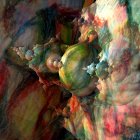 A vibrant landscape features whimsical trees with colorful foliage and a striking tree of yellow blossoms. Two figures walk along a path, enjoying the serene, picturesque scenery.
