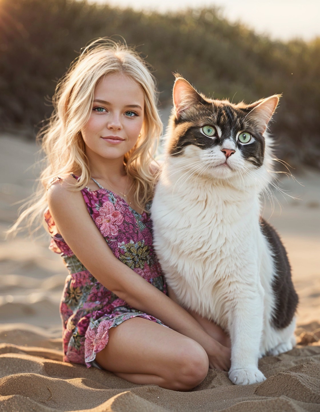 A young woman with blonde hair in a floral dress sitting beside a large fluffy cat, both looking into the distance.