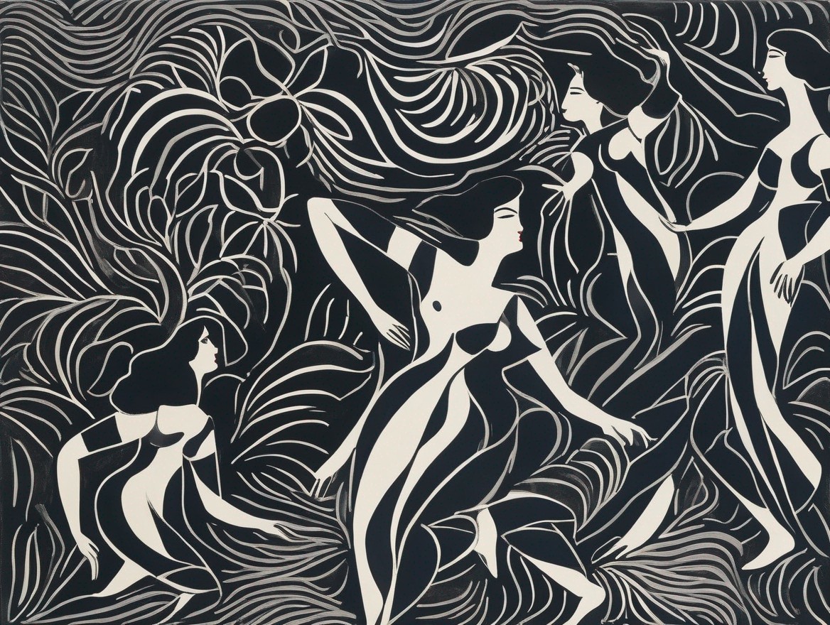 Stylized Female Figures in Vibrant Blue and Red Attire