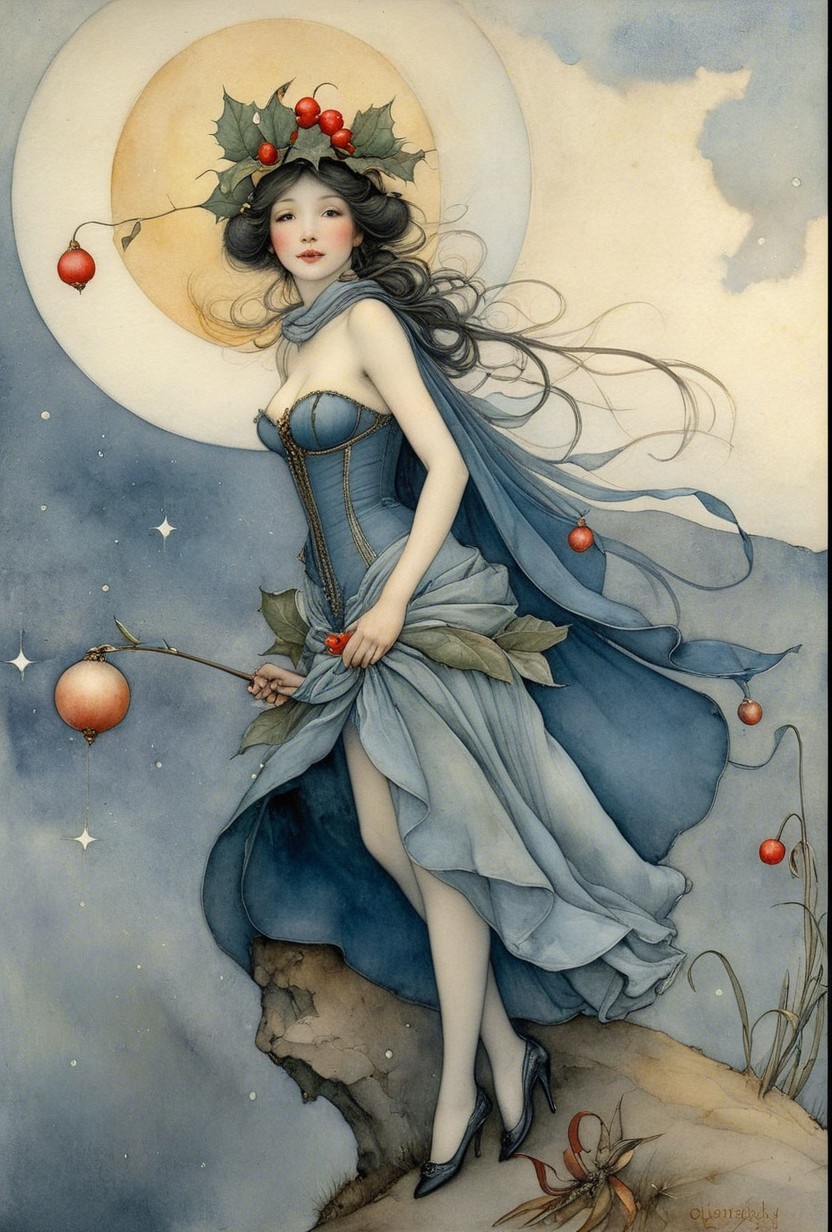 A fantastical figure stands gracefully, adorned with a crown of leaves and holding branches of fruit. She is enveloped by two large moons, with a quaint house and curious animals nearby.
