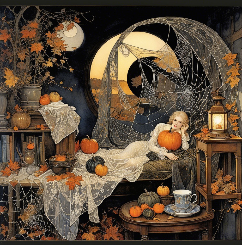 A young woman in a white veil sits at a wooden desk adorned with pumpkins, lanterns, and spiderwebs. Autumn leaves frame the window behind her, creating a cozy, mysterious atmosphere.
