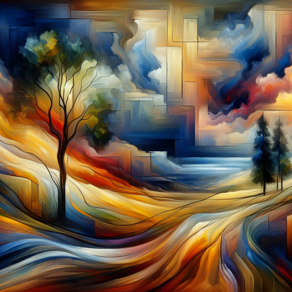 A vibrant landscape features bold, abstract trees with colorful foliage beside a tranquil river. The scene glows with warm hues under a soft sunset sky, creating a serene atmosphere.