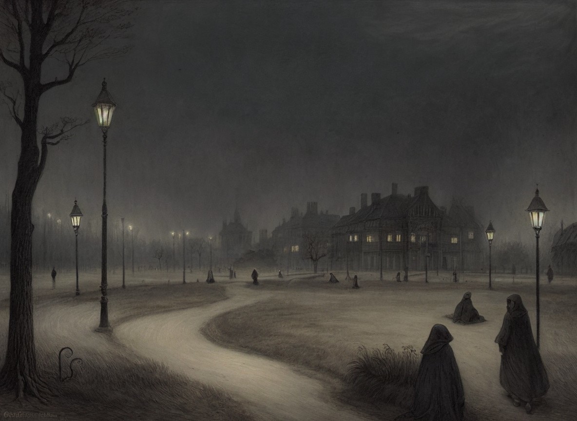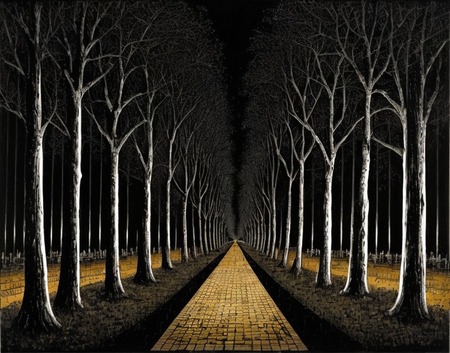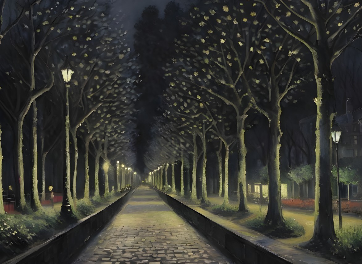 A serene, nocturnal painting of an alley lined with tall, leafy trees under a dark sky, illuminated by distant street lamps.