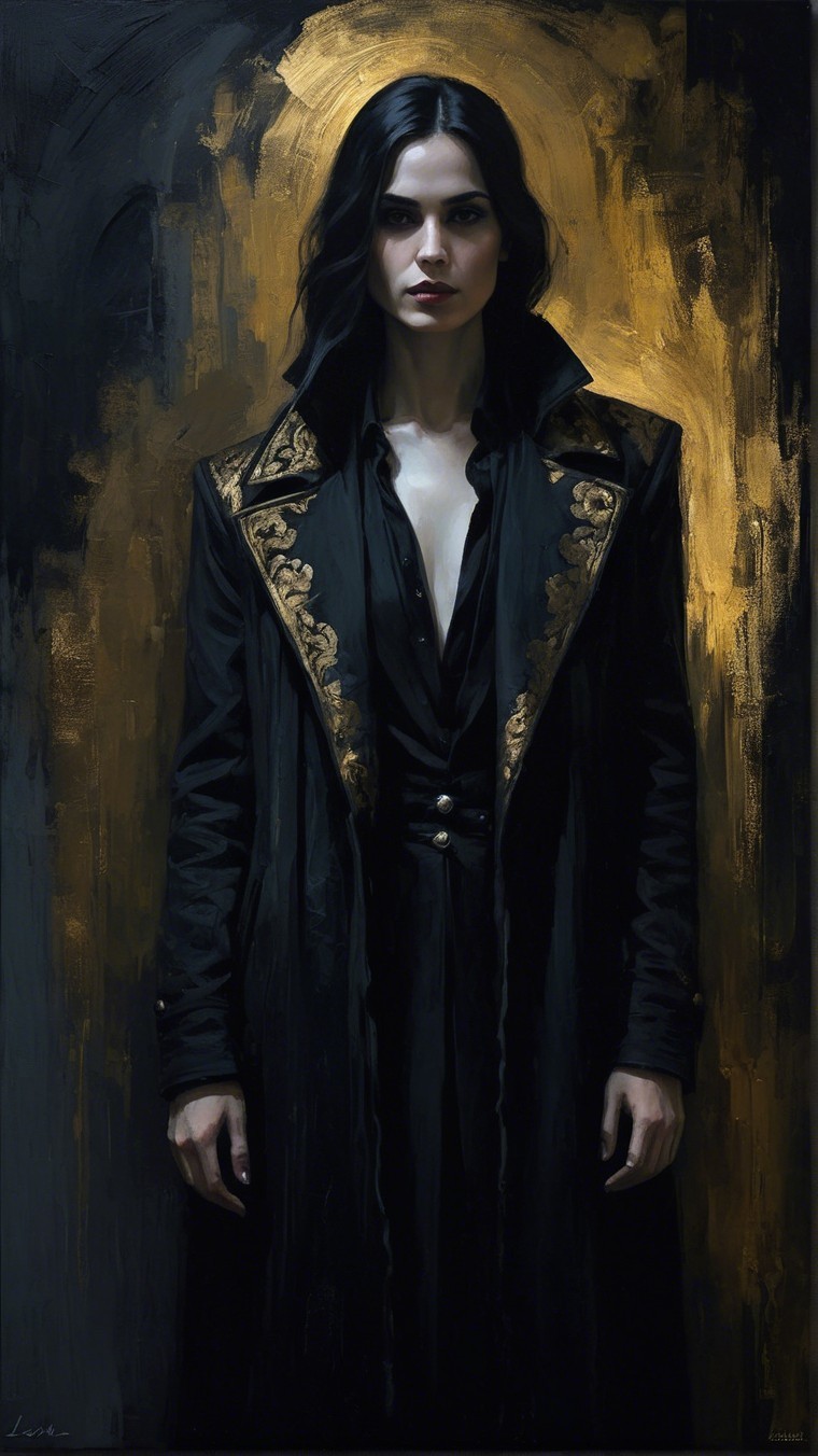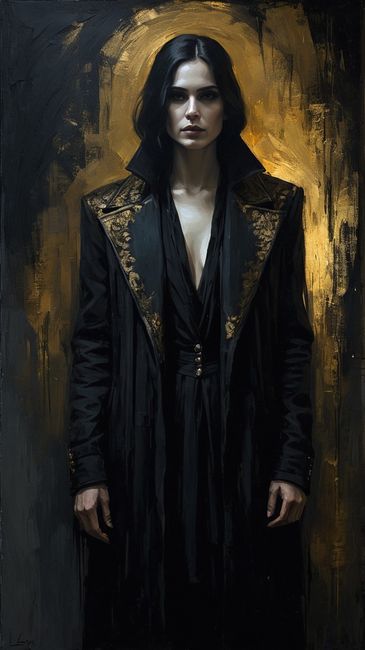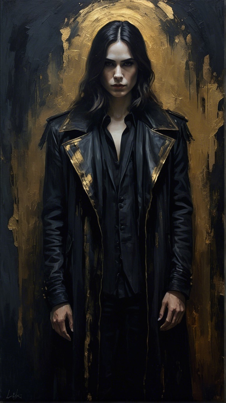 A striking figure stands confidently, cloaked in a long, dark coat with golden accents. His intense gaze and sleek hair contrast against a mystical golden backdrop, creating a powerful aura.