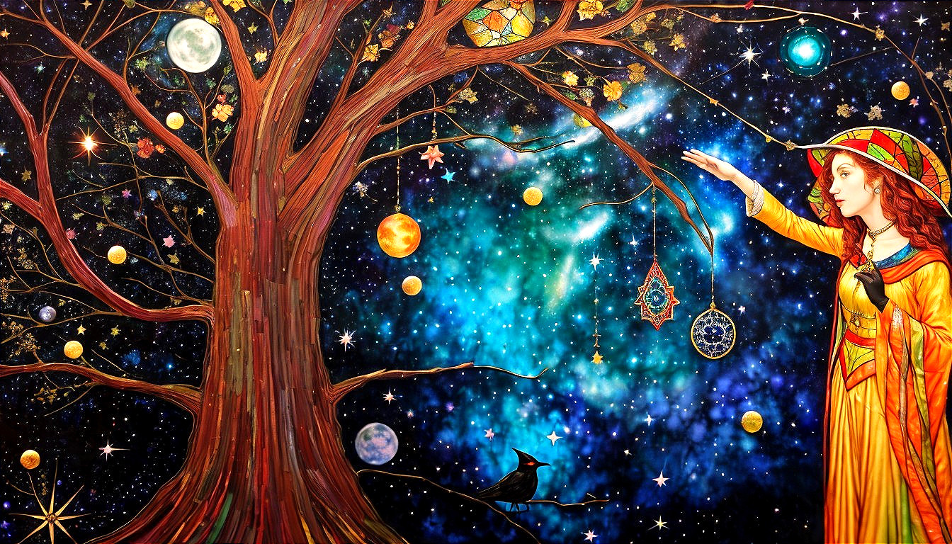Prompt: black robed witch reaching for tree, tree, highland flower spectacular, intricate absurd cosmic night sky with a full bright large moon and stars, parts of background is a photo of galaxies, made of mixed media, acryllc, stained glass and metallic paints
