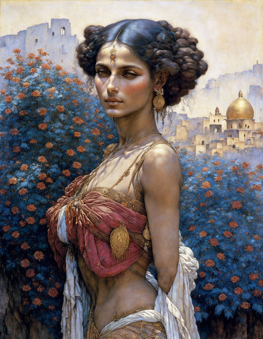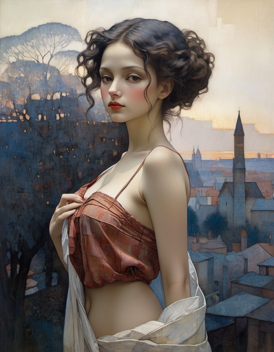 Ancient cities, ancient tales. Beautiful exotic woman. Keep clothes on. Arthur Rackham Paul Klee Norman Rockwell anatomically correct Steve Hanks muted tones, somber, desaturated colors Soft, somber, delicate Soft dappled lighting. Golden hour. Leonardo, Durer, Schiele, Degas, Mondrian - mixed media