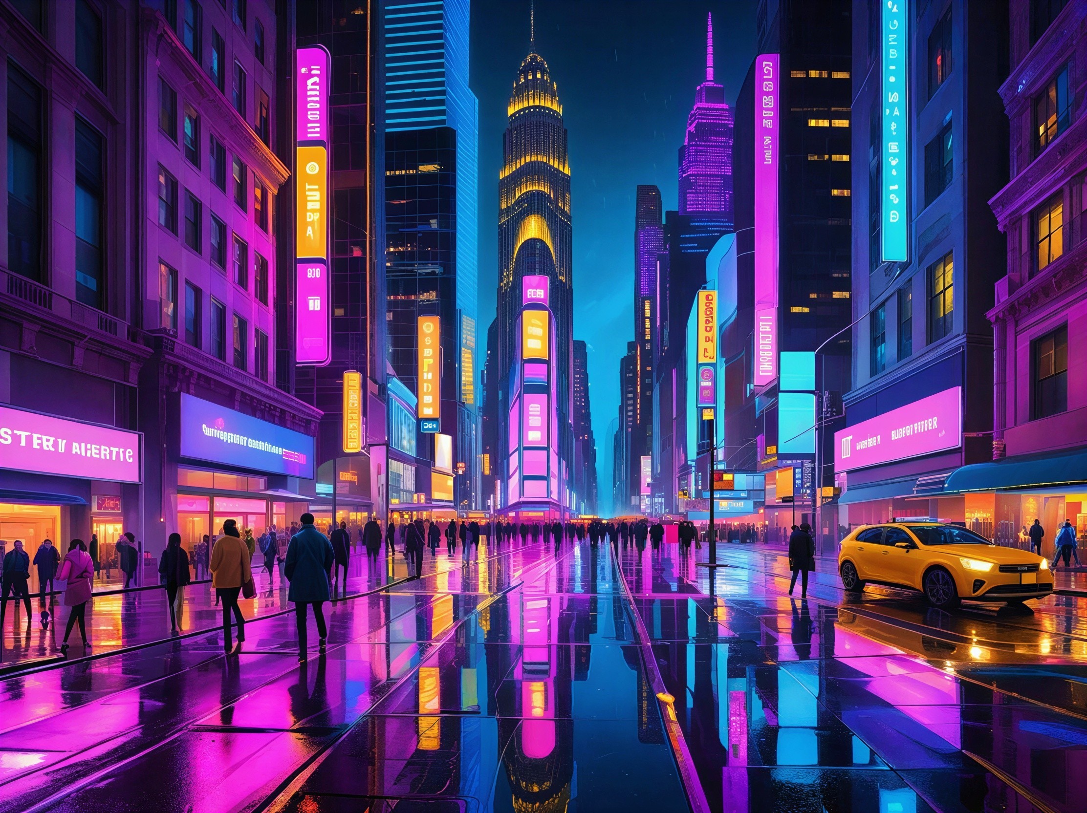 A vibrant night cityscape is illuminated by dazzling neon lights, casting a futuristic glow on wet streets. Skyscrapers with bright yellow and magenta accents pierce the dark sky, their reflections shimmering on the slick pavement. Tall vertical billboards display abstract characters in shades of pink, orange, and blue. Numerous people, some with