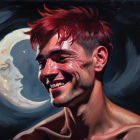 A vibrant painting of a smiling man with striking red hair, set against a dreamy night sky with a luminous moon. His expression exudes joy and warmth, capturing a moment of happiness.