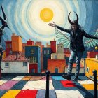 The image features a surreal urban scene with a figure in a black cape and horns beside a man in a suit with vibrant, patterned wings. A bright sun and colorful cityscape enhance the dreamlike quality.