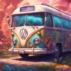 magical mystery tour bus.Concept art. A magical mystery tour bus drives through a vibrant, surreal landscape. The bus is adorned with psychedelic patterns and whimsical decorations. Wide shot. Swirling, dreamlike colours and textures emanate from windows. Intricate, glowing runes cover the bus exterior. A fantastical, alien flora blooms along the roadside. Luminescent, ethereal lighting. Psychedelic, whimsical, dreamlike, vibrant, surreal, fantasy, illustration, detailed, high quality, art germ.