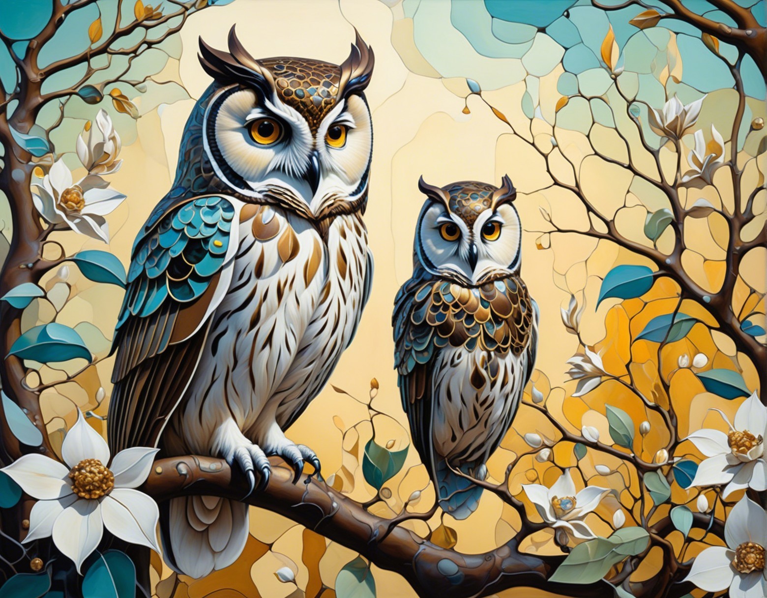 A stunning stained glass artwork features two intricately detailed owls perched on a branch, surrounded by vibrant foliage against a warm background, showcasing rich colors and textures.