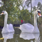 A serene landscape features graceful swans gliding on a tranquil lake, with a charming bridge and a cozy cottage amidst lush greenery. Two figures walk on the bridge, enjoying the peaceful scene.