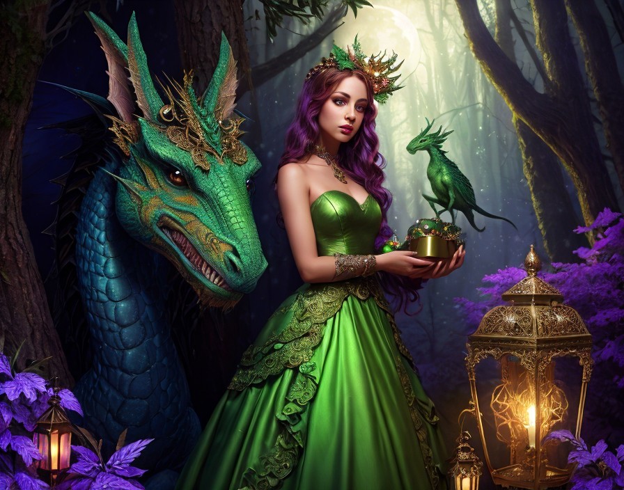 Prompt: New Year mystery in the style of Carrie Ann Baade: in a mystical magical forest under the Moon, beautiful creatures and a green dragon around a Christmas tree and gifts, clearly worked out details, extremely detailed high-definition concept art with 16k resolution, fantasy, very attractive, intricate, dynamic lighting, ultra-clear image