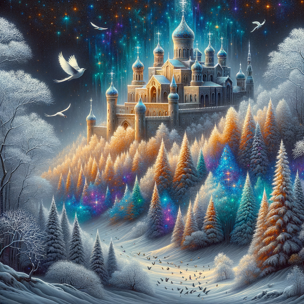 Prompt: "A white castle on a hill with trees. birds in front of a castle. dreamscape, frost, winter, white landscape, thick snow, Misty. Mystery. watercolour, style by Thomas Wells Schaller, Maxfield Parrish and Ivan Bilibin, vibrant colours, intricate, magical, elegant, beautiful, colourful, bioluminescent highlights and atmosphere, crisp quality, epic scenery, Daniel Merriam art station, integrated flowing composition, extremely detailed, festive theme, sparkling, glittering, watercolour in silk, starry night, delicate painting,"