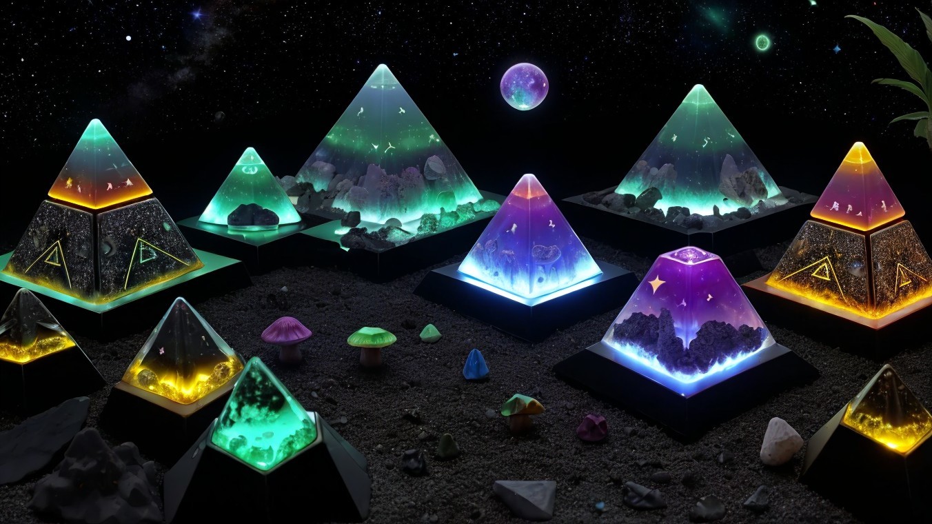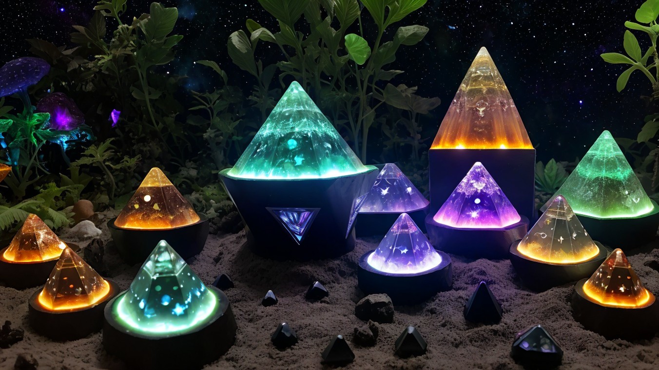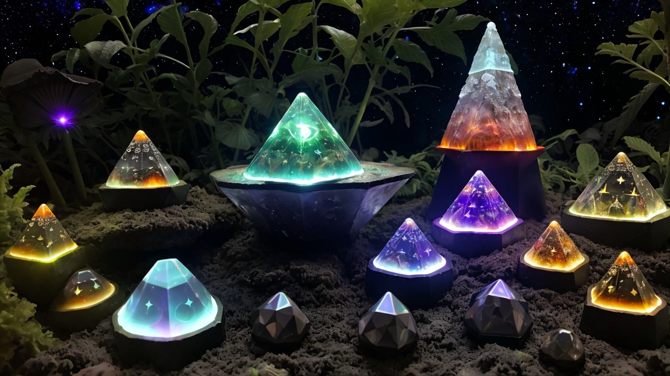 Illuminated colorful crystal pyramids arranged on dark soil among plants, creating a mystical and enchanting scene.