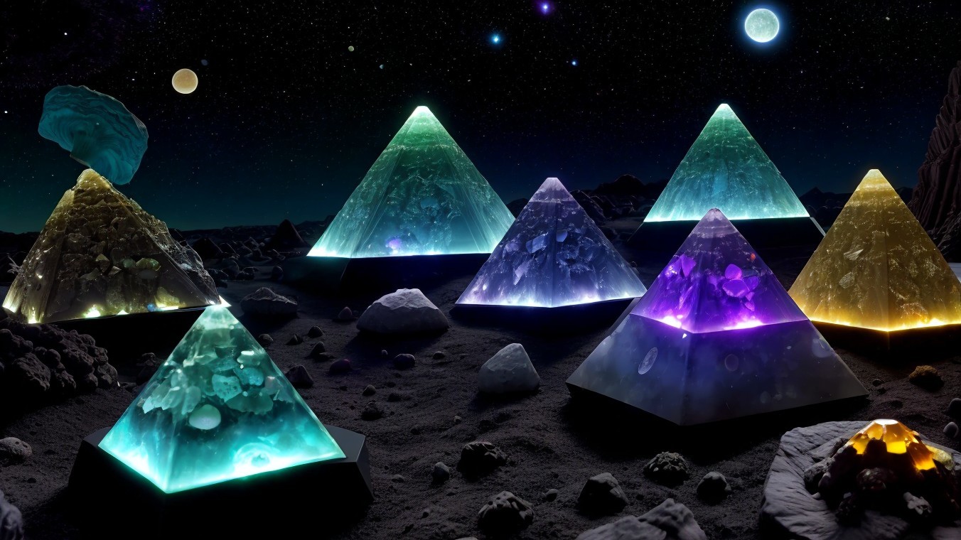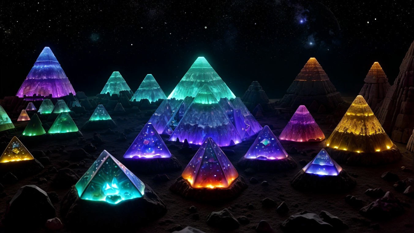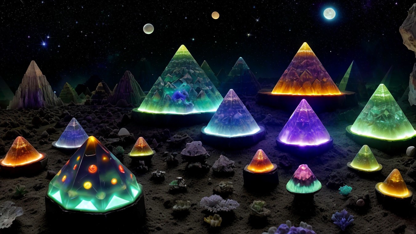 Illuminated colorful crystal pyramids arranged on dark soil among plants, creating a mystical and enchanting scene.