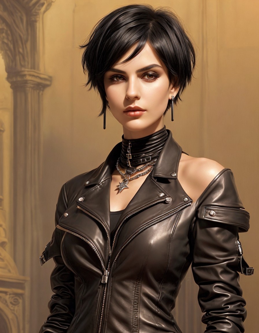 A stylized portrait of a woman with short black hair and a red leather jacket against a muted background.