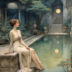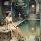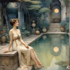 In an opulent room, a woman in a golden gown lounges gracefully on a plush sofa, surrounded by vibrant decor and lush plants. Another figure stands elegantly in the background, enhancing the scene's beauty.