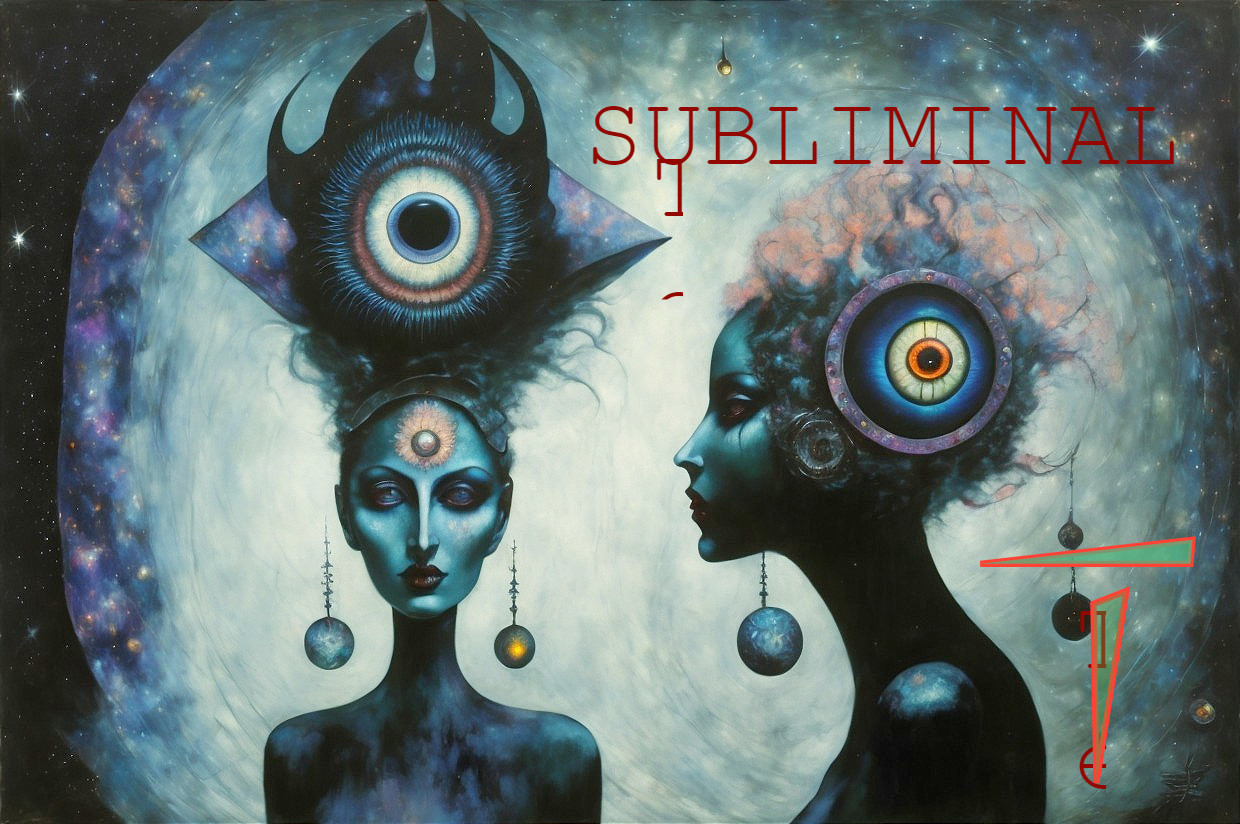 Surreal artwork of two profiles with cosmic elements and large eyes within their heads, titled "SUBLIMINAL."