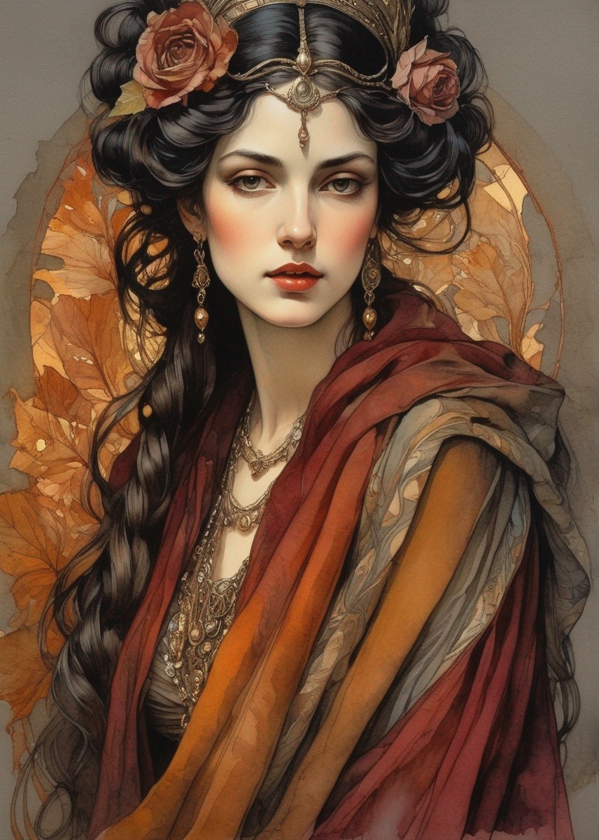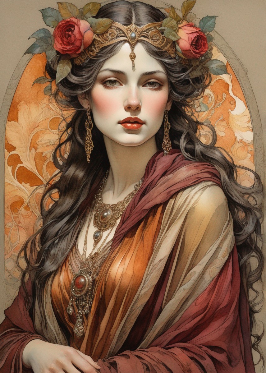 + Prompt:Dryad priestess in flowing shawls, colored ink drawing, watercolor artwork on old withered paper, vintage, by Caravaggio, Fragonard, Anton Pieck, pale colors, high detail, intricately detailed, hyperdetailed volumetric lighting, art nouveau graphic steampunk