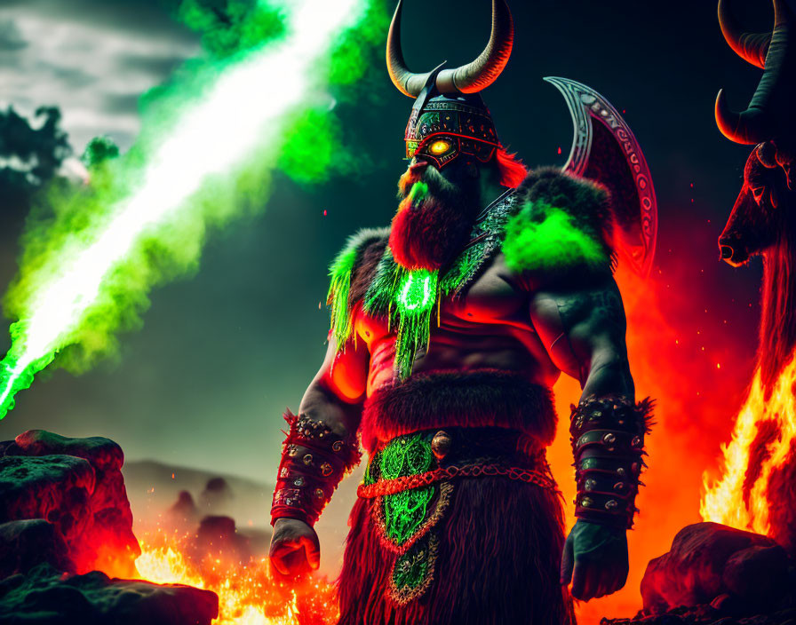 a giant Viking in animal skins with a cattle skull mask, massive muscles, red liquid splatter, divinity gas masked as a green glowing mist inside a glass doom, volumetric orange lava glow, ultra realistic, photo realistic, crepuscular rays, volumetric green smoke columns, detailed key visual, dark atmospheric effects, epic ultra-wide shots, art work by farel dalrymple