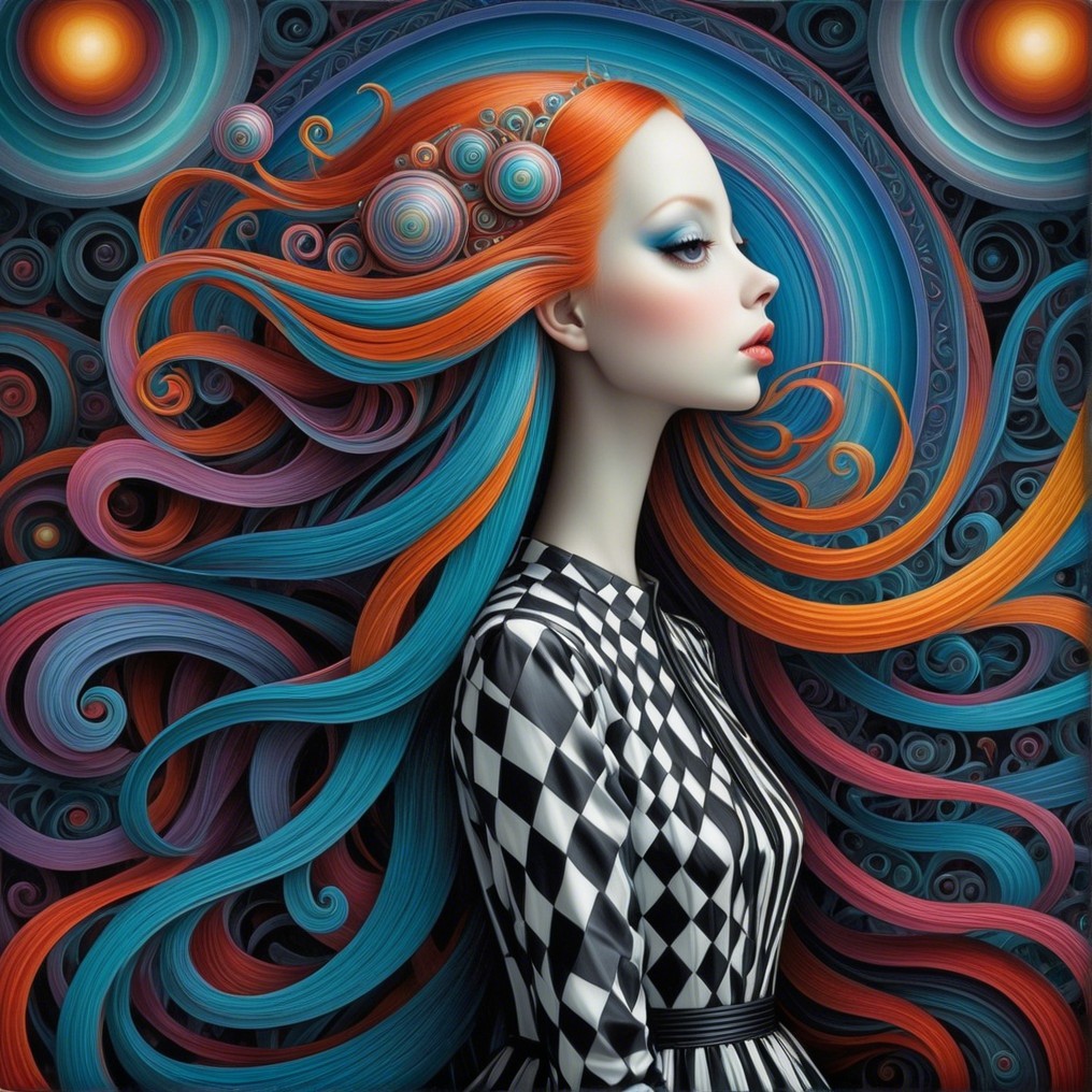 A stylized, vibrant portrait of a woman with flowing blue and orange hair, adorned with abstract orbs, set against a swirling, colorful background, blending elegance with surreal artistry.