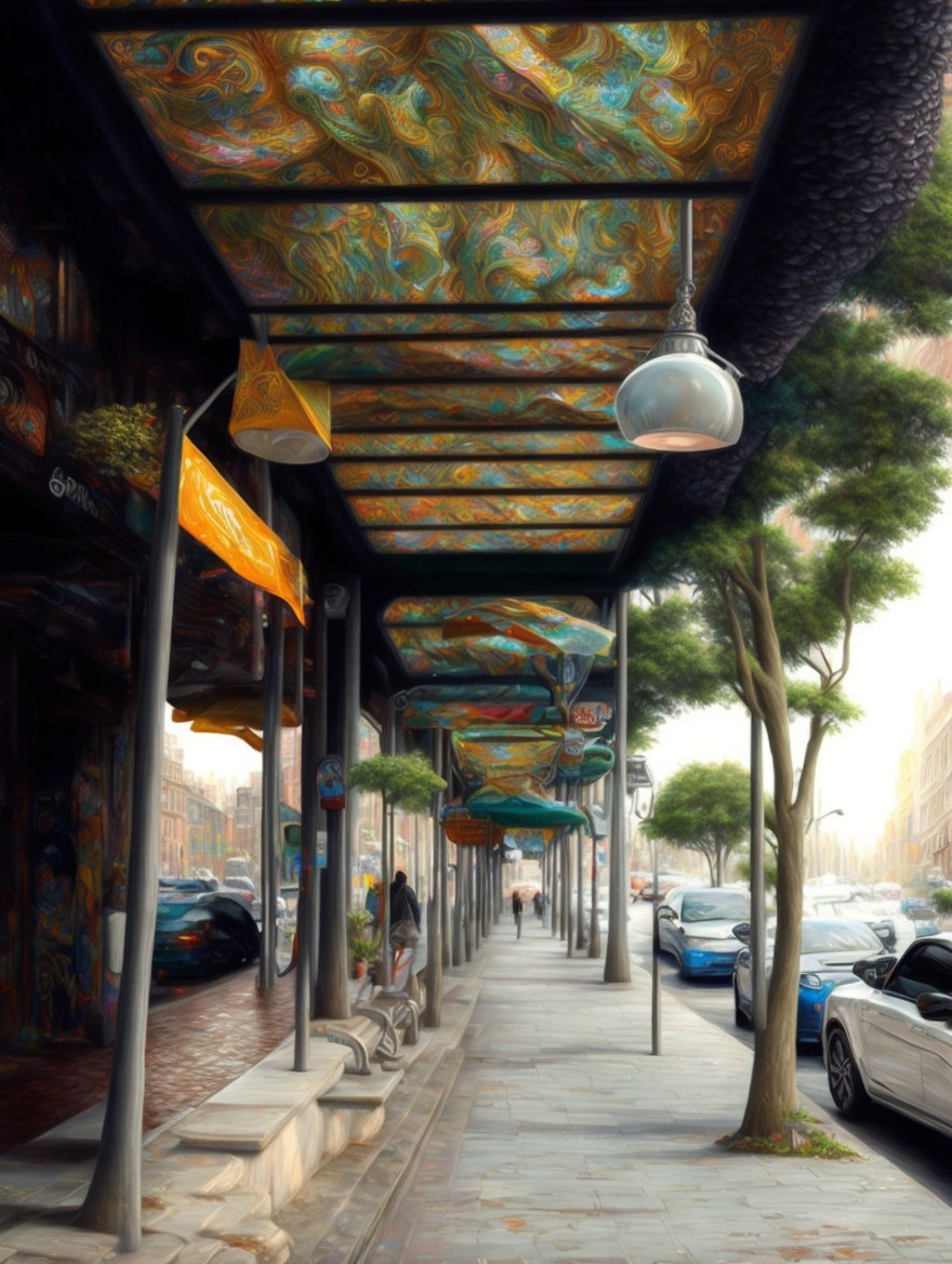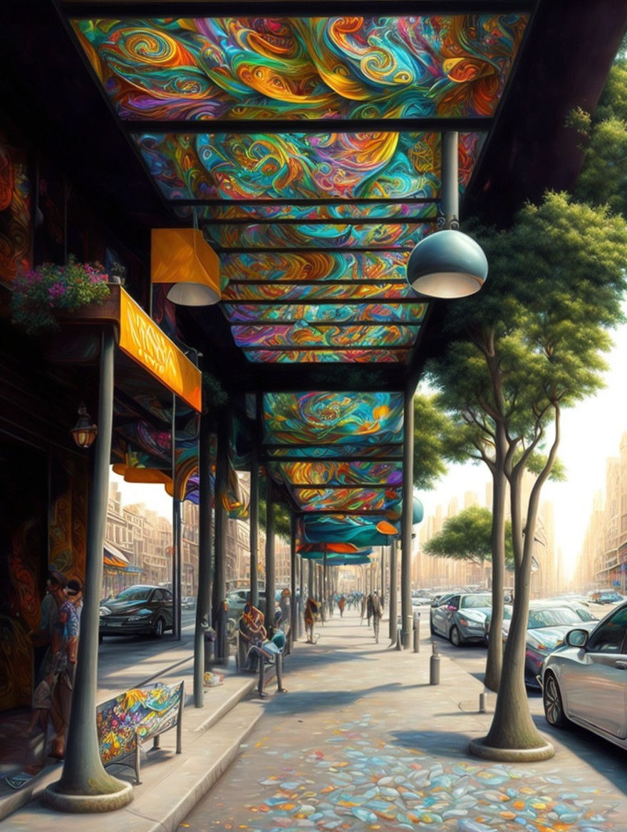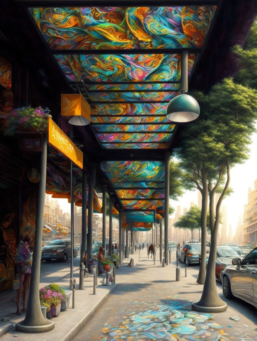 Colorful street scene with psychedelic building patterns and vibrant reflections.