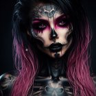 A striking portrait of a model with vibrant, artistic makeup featuring vivid colors and splashes. Her intense gaze and bold lip color create a captivating, high-fashion look.