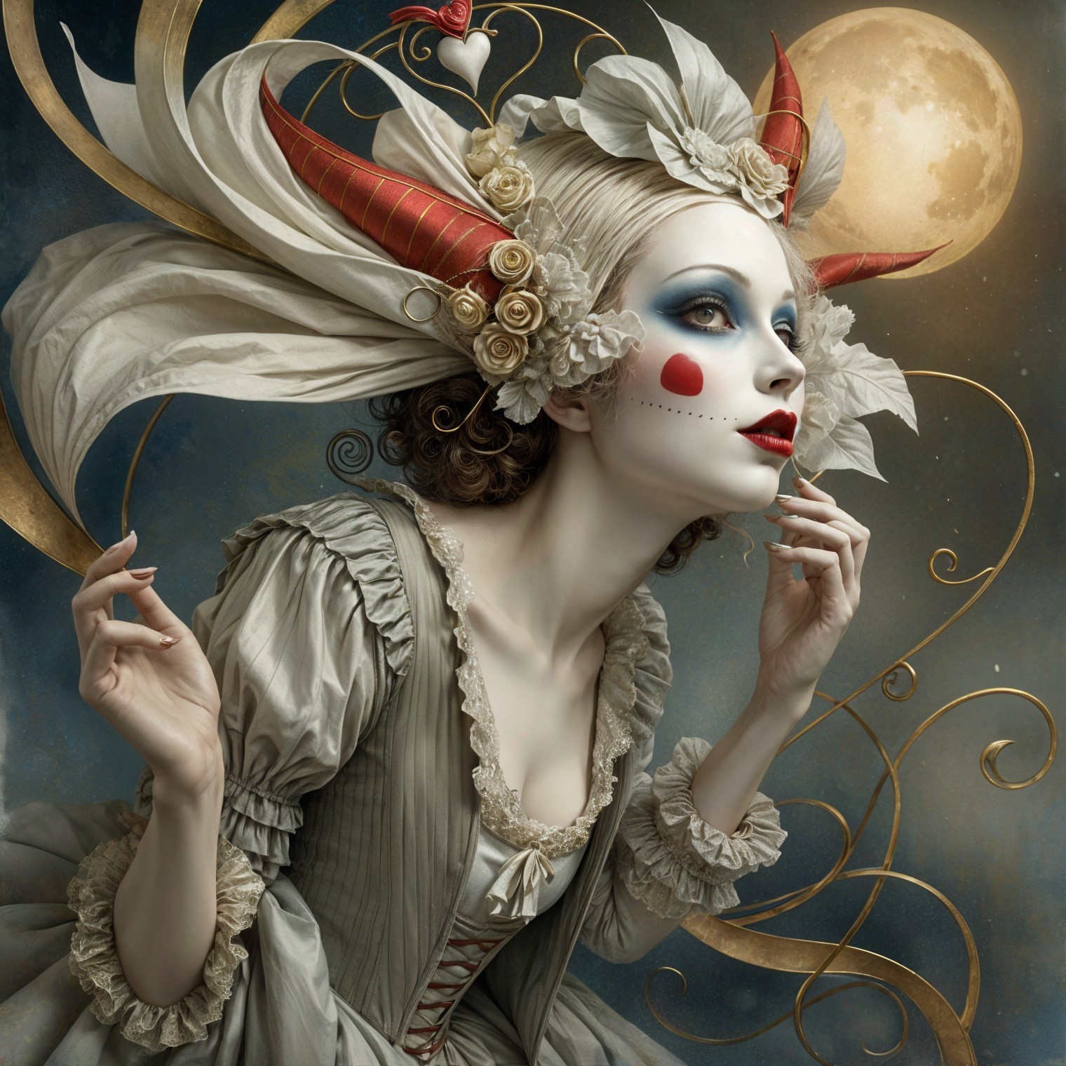 Close up, frightening devious Pierrot creature twisted love in the Valentine maze, in the style of Alexander Jansson. by Catrin Welz-Stein, Michael Parkes