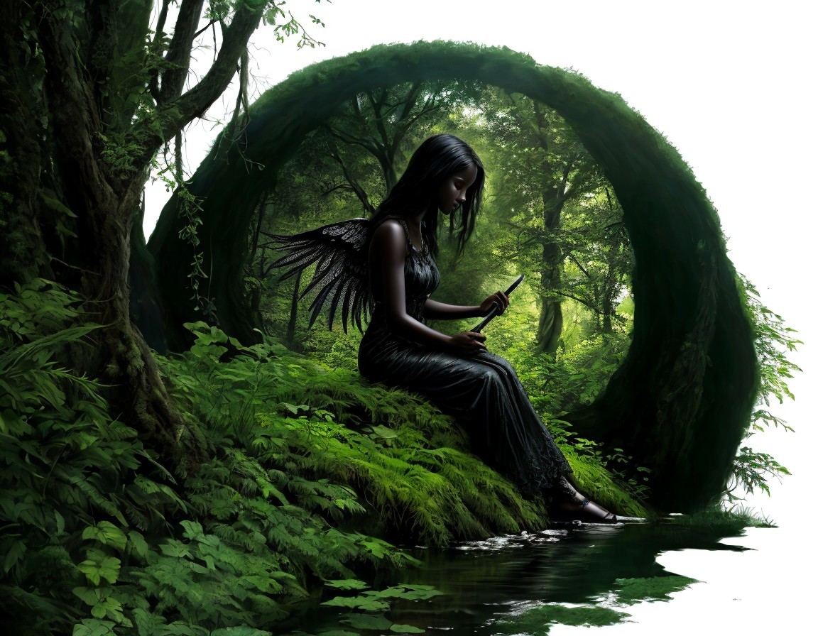 black silhouette of an angel sitting at the edge of a calm stream in the forest :: black and deep dark green theme, 8K, extremely detailed, hyperdetailed, airbrush art, beautiful, award winning, crisp quality, digital art, pencil sketch, mixed media