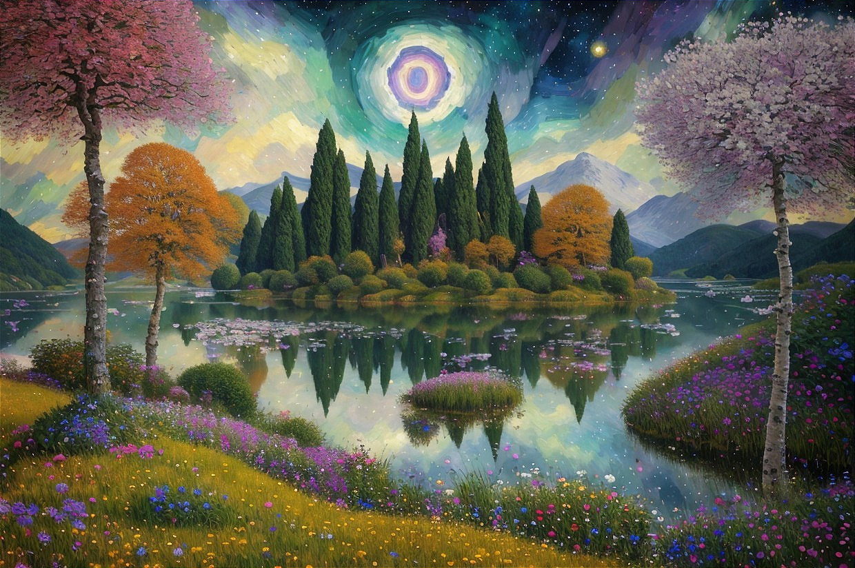 A serene, fantastical landscape with vibrant flowers, green trees, snow-capped mountains, and a lake reflecting a swirling, starry sky.