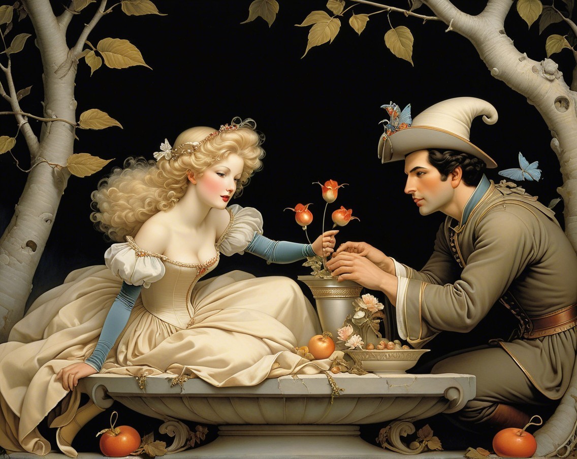 A serene scene features a fairy-tale princess in a flowing white gown, holding oranges, sitting beside a heroic figure adorned in armor, with whimsical creatures nearby in a mystical setting.