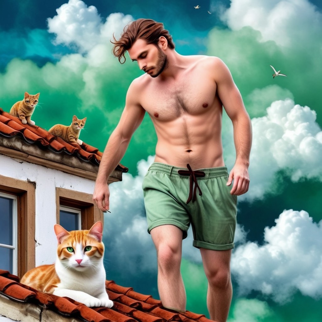 Prompt: To look at our old cat walking on the roof,Mix cigarette smoke with the clouds, A man at an open window, cozy, in the style of modern illustration, filigree, black and white + background with gray sky and dark green figures in the style of mixed collage, light pastel shades of powder green, turquoise, dark blue, abstraction, fauxfurcore
