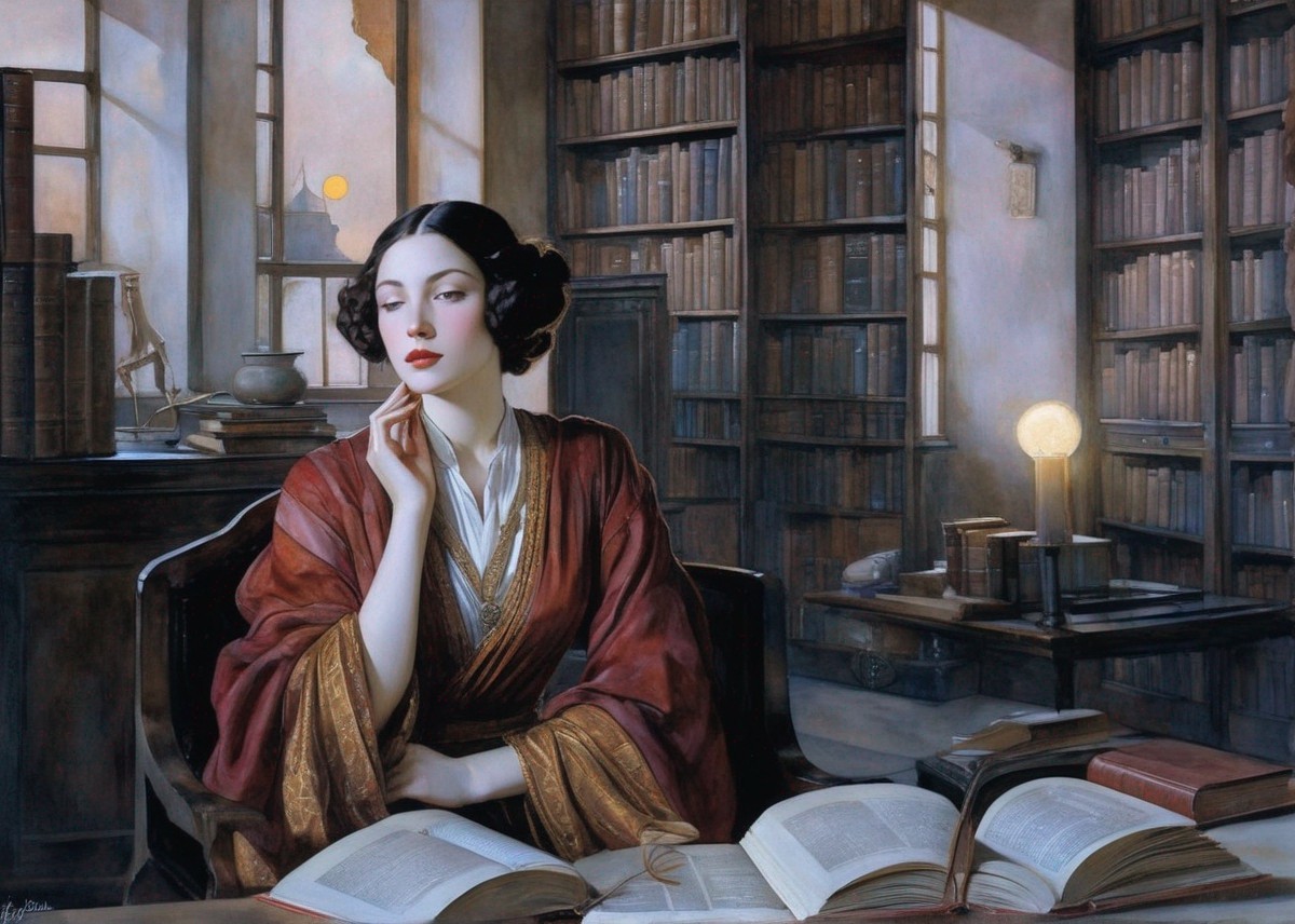 + Prompt:A stunning enchantress, adorned in an exquisite library, engrossed in the examination of ancient manuscripts under the gentle glow of moonlight.