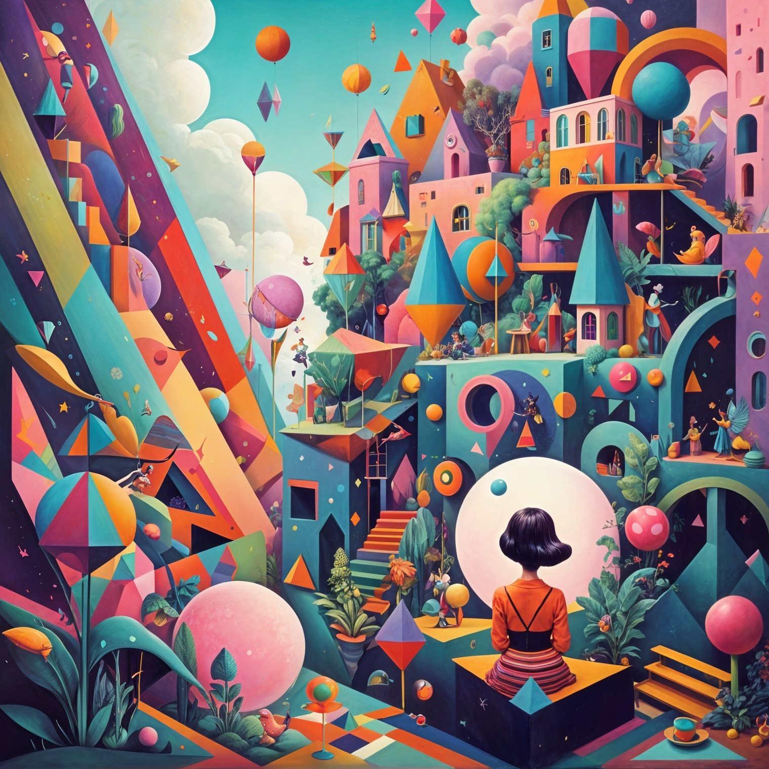 A vibrant, fantastical landscape filled with colorful towers, oversized spheres, and whimsical shapes. A person walks through this surreal world, surrounded by playful elements and a dreamy atmosphere.