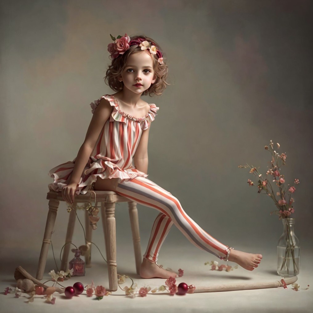 A young girl sits gracefully on a stool, wearing a striped outfit and floral accessories. The soft, muted background enhances her serene expression, surrounded by delicate blossoms and fruit.