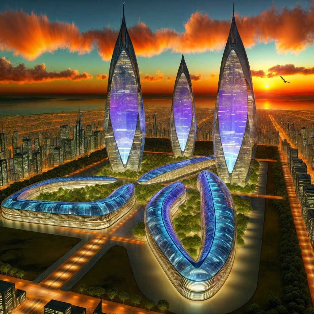 A stunning sunset illuminates futuristic twin towers with sleek, reflective surfaces. The organic, wave-like base integrates greenery, creating a harmonious blend of nature and modern architecture.