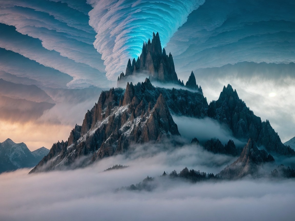 A dramatic mountain rises above a sea of clouds, crowned by a castle. Swirling, stormy clouds swirl above, creating a mystical and atmospheric scene bathed in twilight colors.