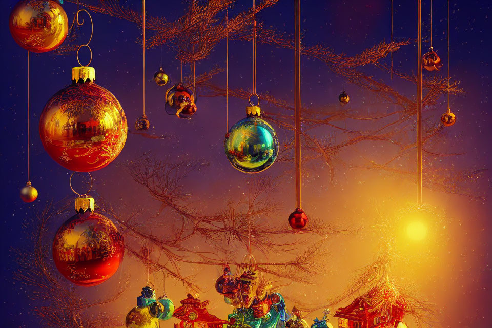 Prompt: "Hyperdetailed painting of a magical christmas ornaments, christmas, by Ismail Inceoglu, Huang Guangjian, Ed Wilmore and Geoff McDowall, Roly Edwards, Hergé, 8k resolution, golden hour, CGSociety, colourful, romantic, ZBrush Central, fantasy art, a masterpiece"