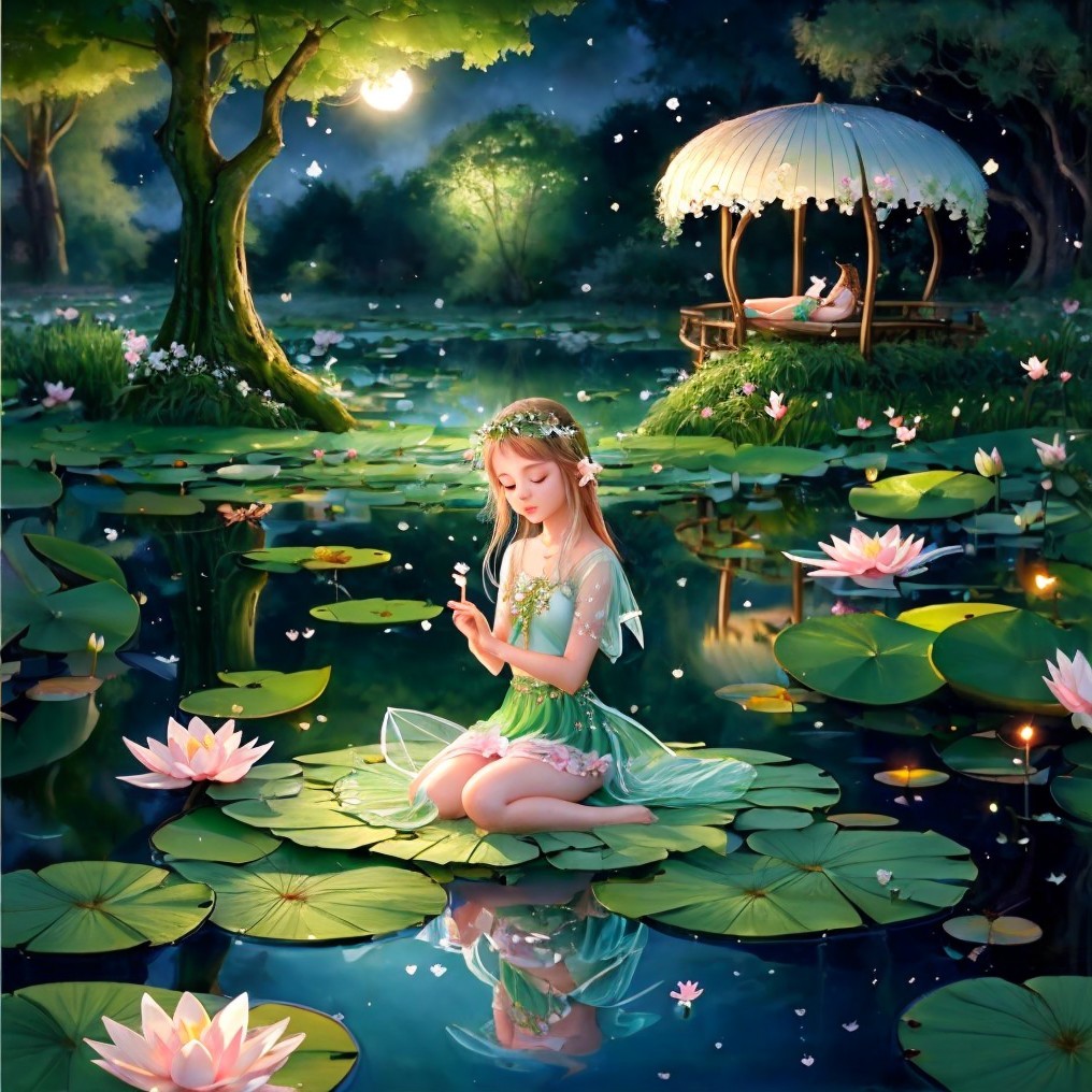 A serene image of a girl sitting on a lily pad among blooming lotuses in an enchanted pond, with a gazebo in the background.