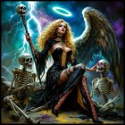 A mystical scene featuring a winged woman seated among skeletons, adorned in dark, elaborate attire. Behind her, a glowing aura radiates from ancient ruins, evoking a fantastical atmosphere.