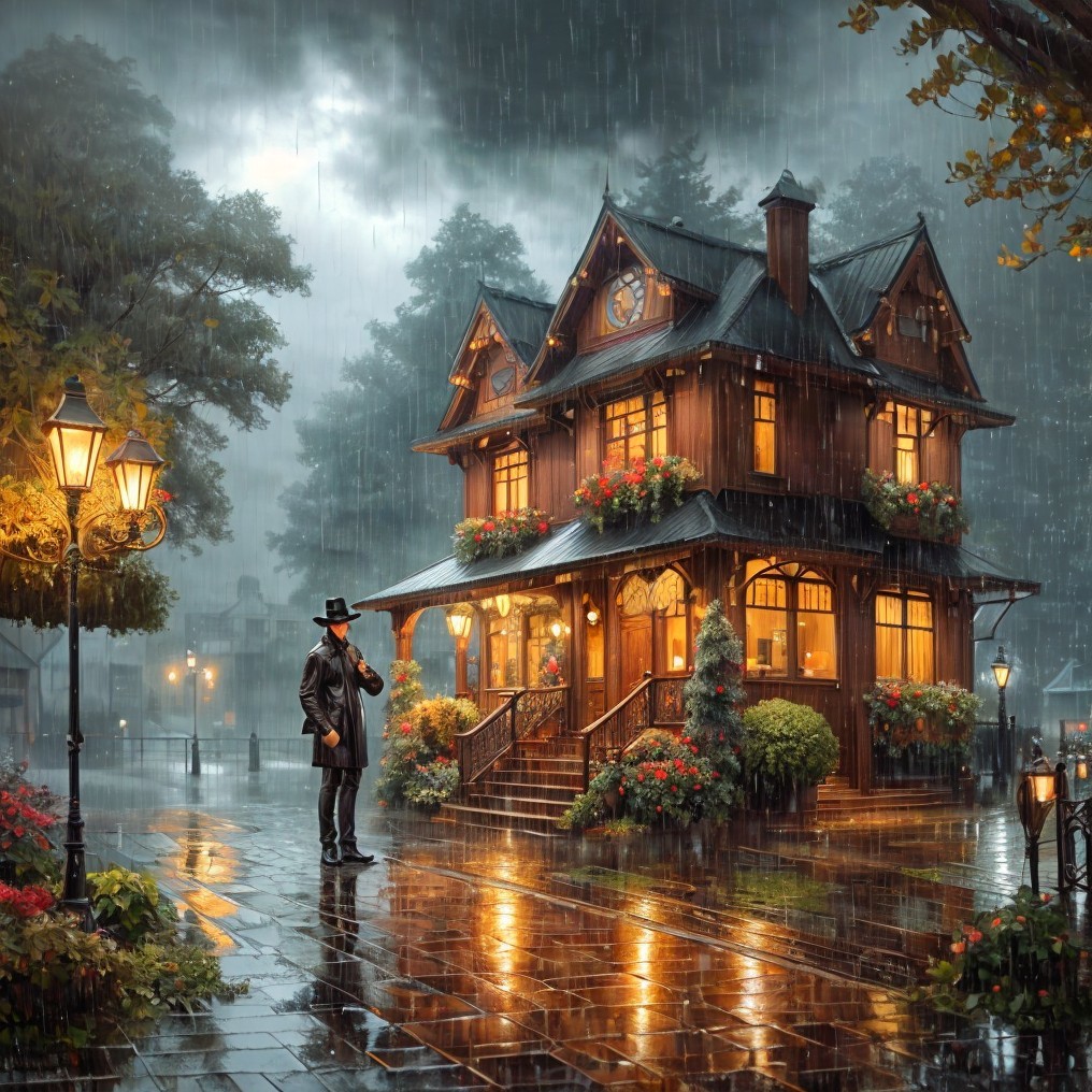 A person stands by a lamp post on a rain-soaked street, facing a warmly lit, cozy Victorian house amidst a heavy downpour.