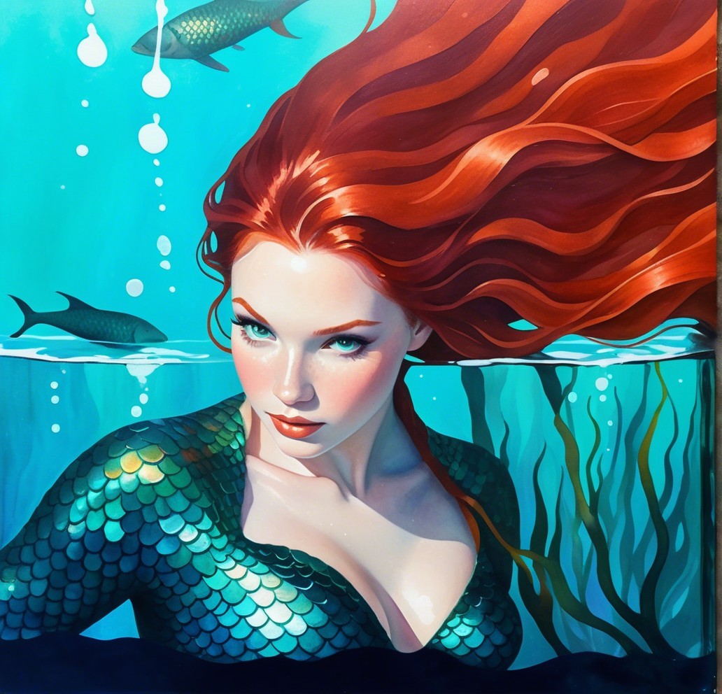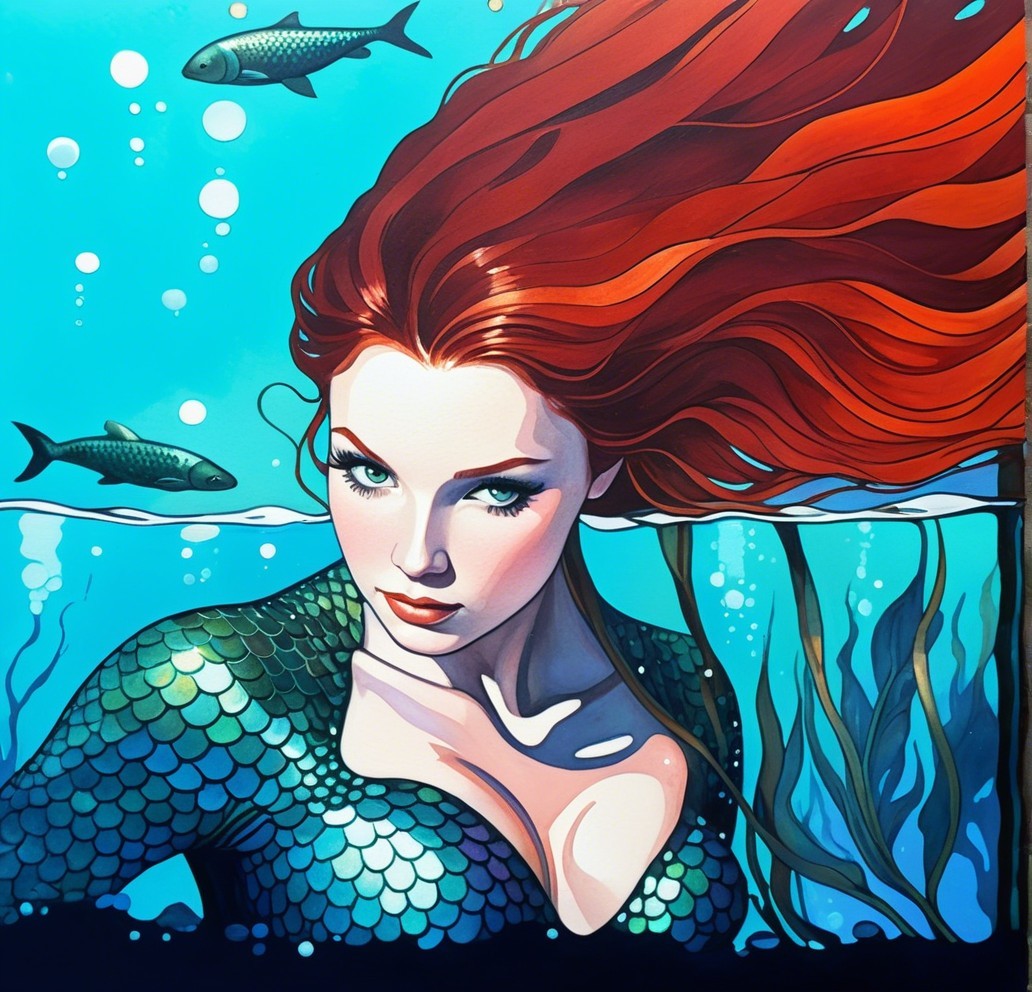 Mermaid with flowing reddish hair, underwater setting, upper body shot, nacre effects, intricate painterly textures using gouache, acrylic, soft watercolor techniques. Organic color gradients with softly glowing highlights, retro-futuristic look with dynamic orphism. Subtle layering mimicking light on glass or water, delicate tones, shimmering highlights, adventurous, ointed, clear, detailed line art, billowing, high plasticity, stylized juvenile facial features, whimsical watercolor and ink, enchanting rockette twist, intricate outlines, woodcut print reminiscence, headshot, stacked-up perspective. Uhd, hdr, debeh, dof, bokeh, juminocore details, primitivism by Ed Binkley and Man Ray, abstract psychosomatic surrealism, radiant glow. Soft gradients blending dreamy, futuristic atmosphere, small abstract shapes, narrative-driven style. Tactile, handcrafted aesthetic, detailed and colorful, high resolution for intricate details. soft watercolor washes,collagraphy merged with giclée print, enchanted female, style of 1970s Retro Psychedelic and dystopian collage art, double exposure portrait, tetradic color scheme in background: light-yellow, dark-blue, deep-blue, dark-beige, overexposed, stylized by Man Ray and Ed Binkley, rule of thirds applied, illustrated and dyed sketch art, simplistic, fantasy art, octane render, uhd,hdr, vfx--inspired, hues by Georgia O'Keeffe, deep textures, dappled lighting, parallax occlusion 1.7, cel-shaded Portrait, stylized 1950s heroine,