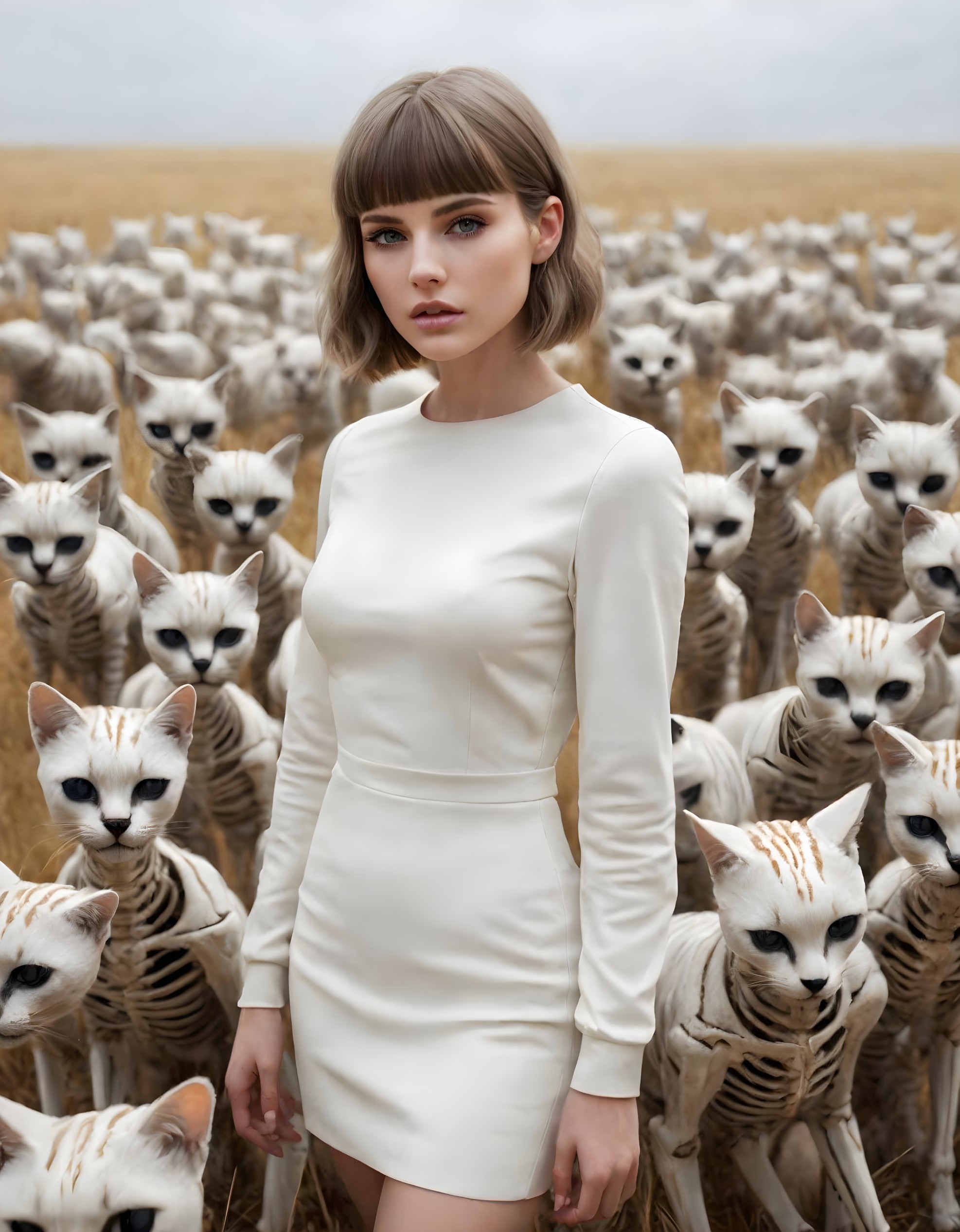 (Try from BlueBrickFace) - A woman in a sleek white dress stands confidently amidst a surreal scene of skeletal cats in a golden field, creating an intriguing and eerie atmosphere.