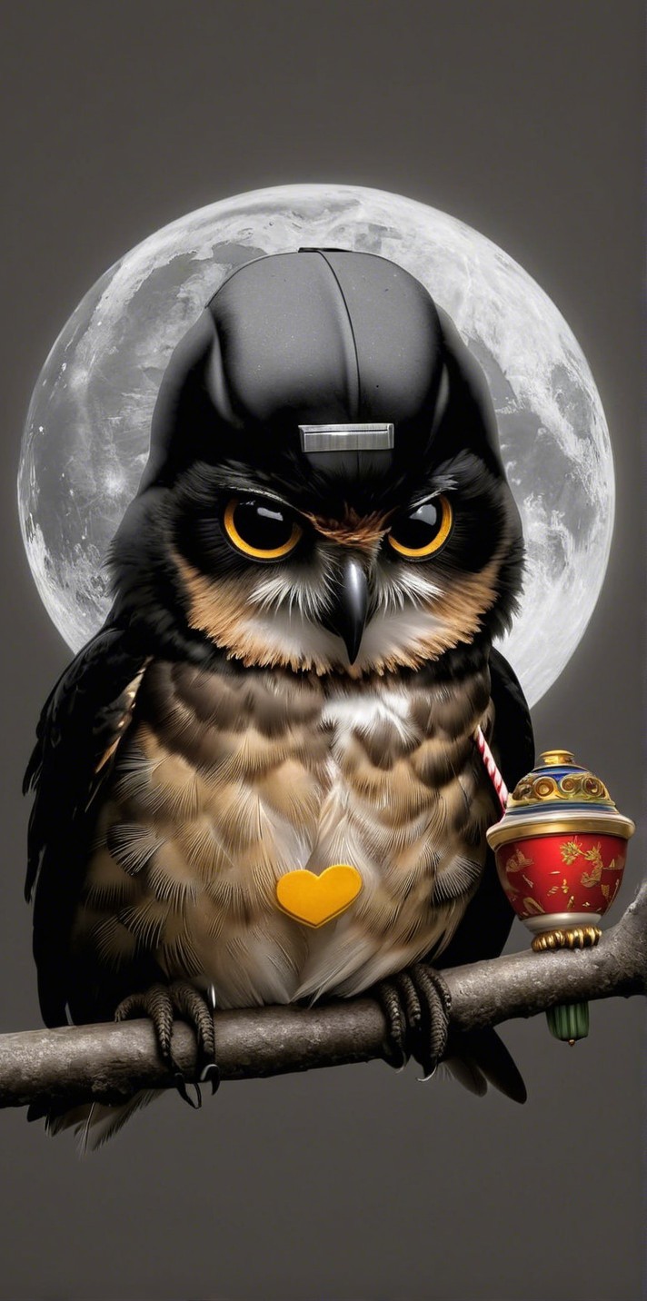 A cute, cartoonish character resembling Batman perches on a branch under a full moon, with large expressive eyes and a furry body. Beside it sits a tiny Spider-Man figure, adding to the playful vibe.