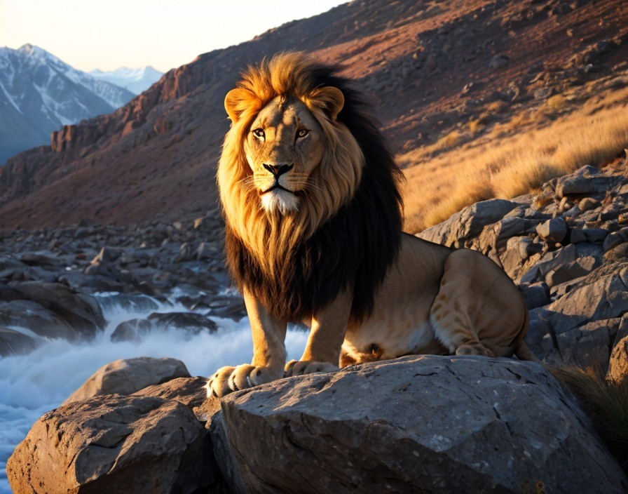 Tigers Resting on Rocky Terrain with Greenery and Mountains