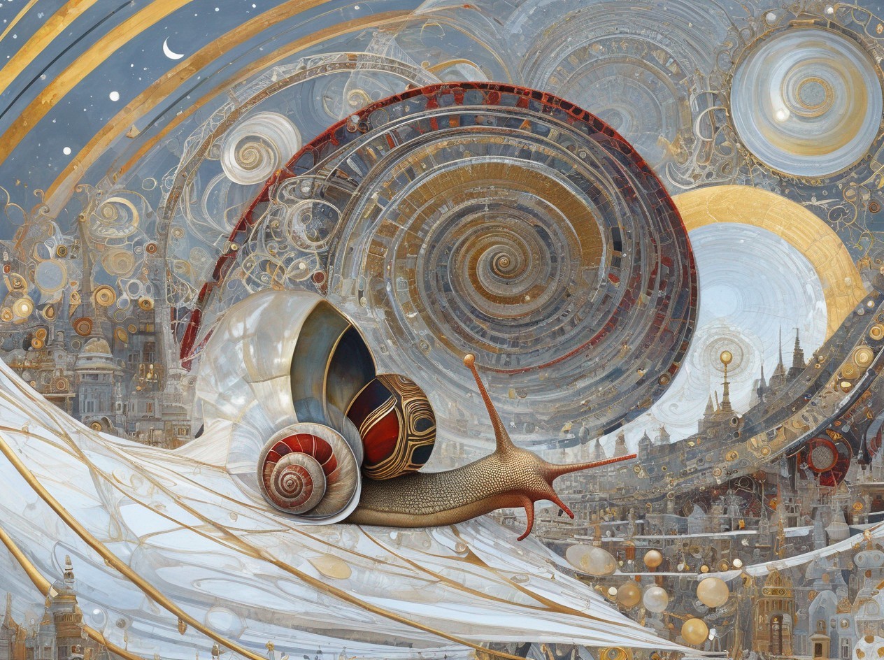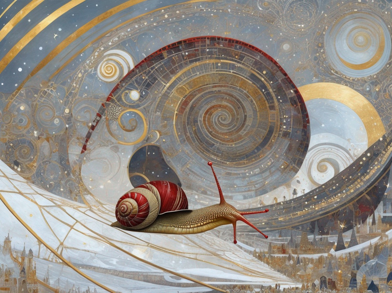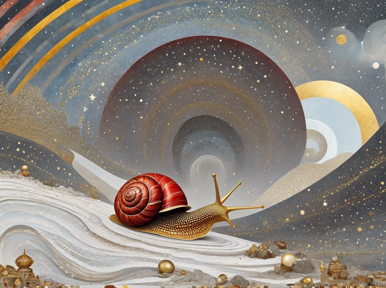A cosmic landscape with snails and planets, showcasing a surreal blend of space and nature with a whimsical touch.